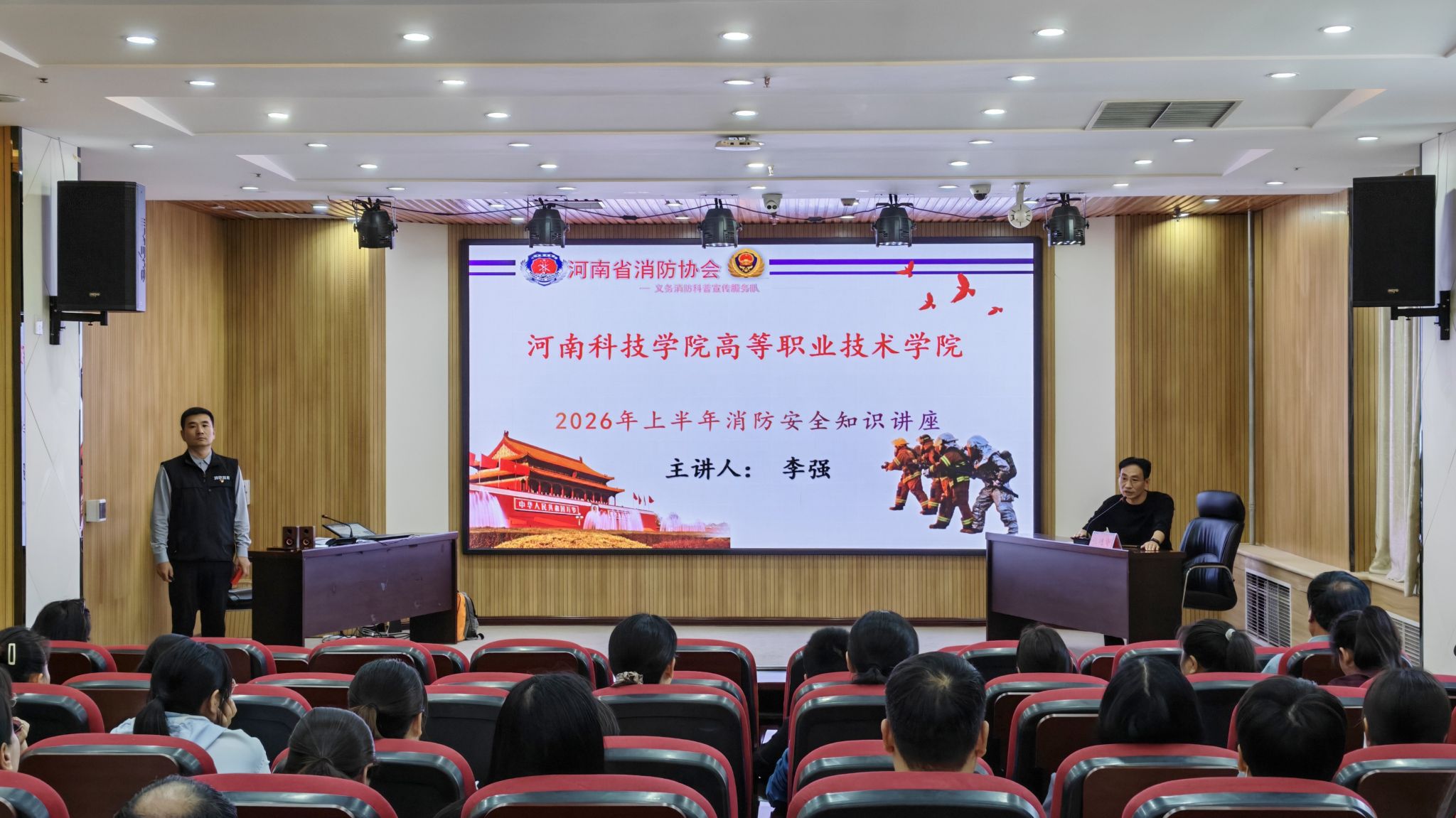 为了使全体师生了解消防基本知识,提高安全防范意识,增强自我保护能力,掌握对突发火灾的应急逃生技能,确保师生生命及财产安全,4月23日,高等职业技术学院特邀河南省消防协会教官李强,在综合楼四楼报告厅作消防安全知识讲座。全体教师和学生代表及物业公司和餐厅工作人员共400余人参加。讲座由学院副院长张兆沛主持。