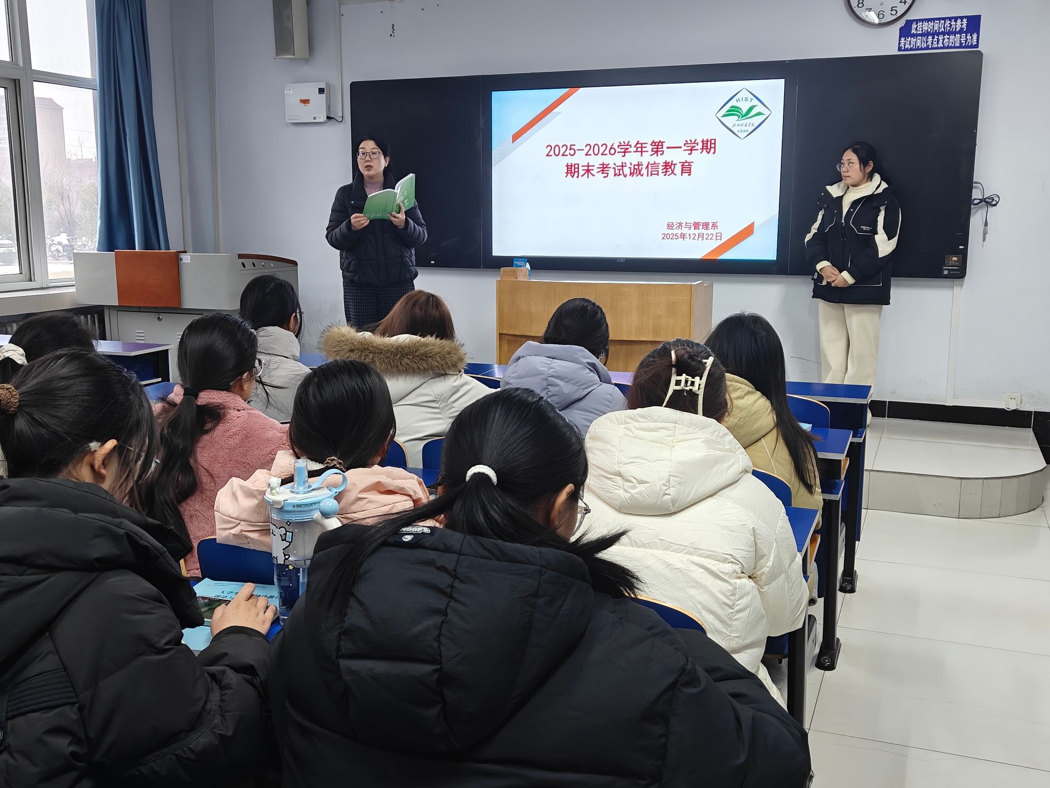 为加强诚信和考试纪律教育,经济与管理系于12月22日下午在综合楼多媒体教室召开了期末考试诚信教育主题班会,教学主任、教学秘书和2025级全体学生参加了此次会议。