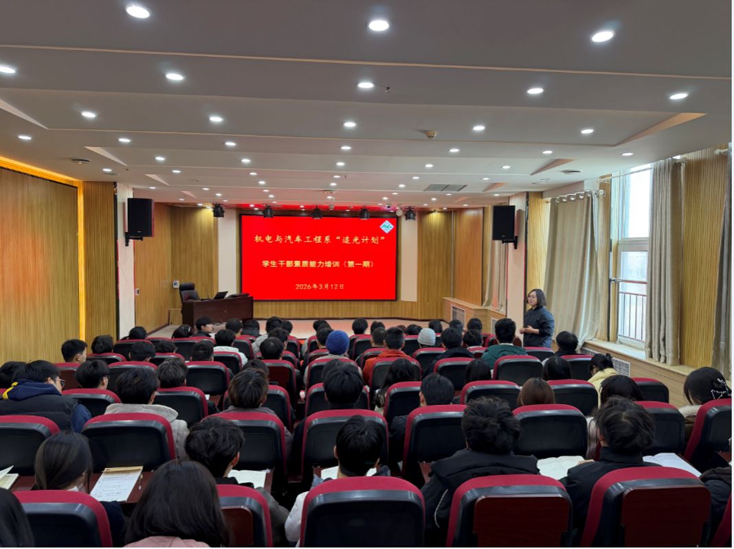 2026年3月12日,机电与汽车工程系在四楼报告厅成功举办2026年“追光计划”暨“开学第一课”学生干部素质能力培训(第一讲)活动。系党支部书记、辅导员、全体学生会干部及班级骨干共同参与。本次培训特别邀请2024级无人机应用技术专业、第三届职业规划大赛省赛银奖获得者梁立帅担任主讲人。他以《平凡起点赴成长之约》为主题,为在场学生干部解锁新学期成长与规划的实用密码。