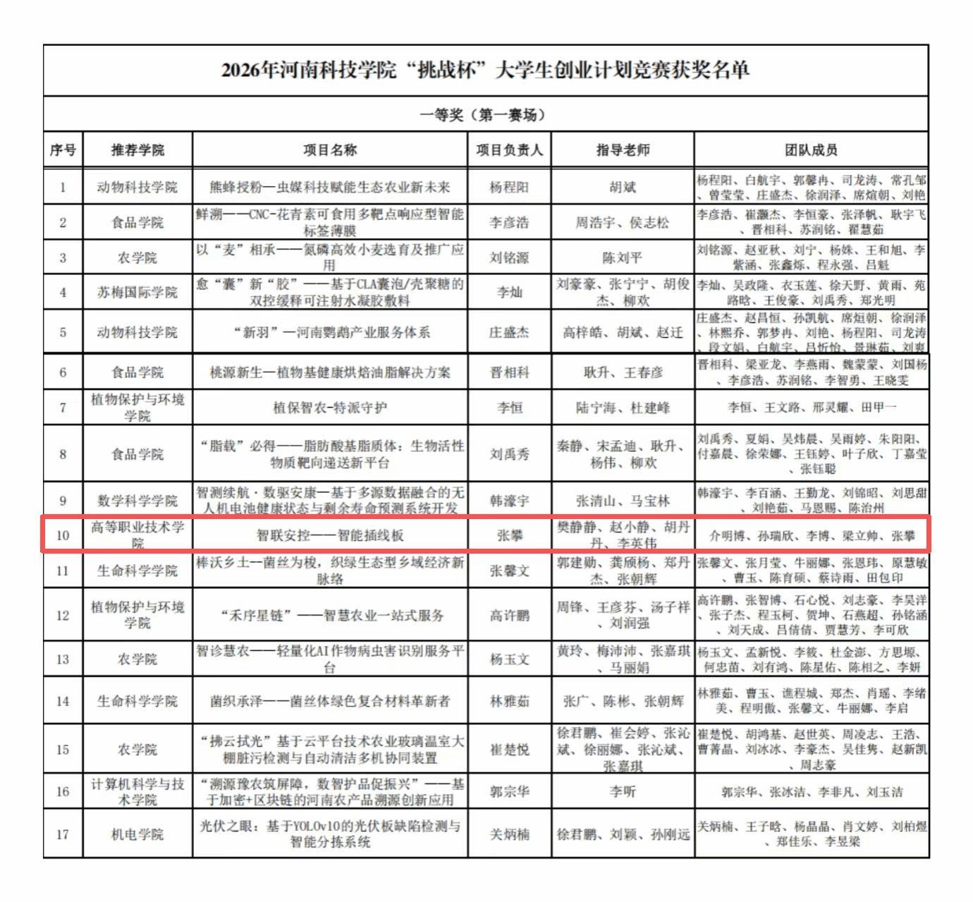 近日,由校团委主办的2026年“挑战杯”大学生创业计划竞赛圆满落幕。机电与汽车工程系学生张攀团队凭借项目《智联安控——智能插线板》,在赛事中表现突出,成功斩获佳绩,充分展现了我系学子扎实的专业素养与强劲的创新创业能力。
