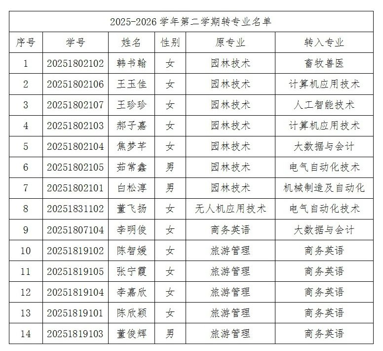 根据《河南科技学院普通本专科学生转专业管理规定(修订)》(校发字〔2024〕86号)的文件精神,按照《关于做好2025-2026学年第二学期学生转专业工作的通知》,现将拟转专业学生名单予以公示,公示时间为2026年3月26日-30日。